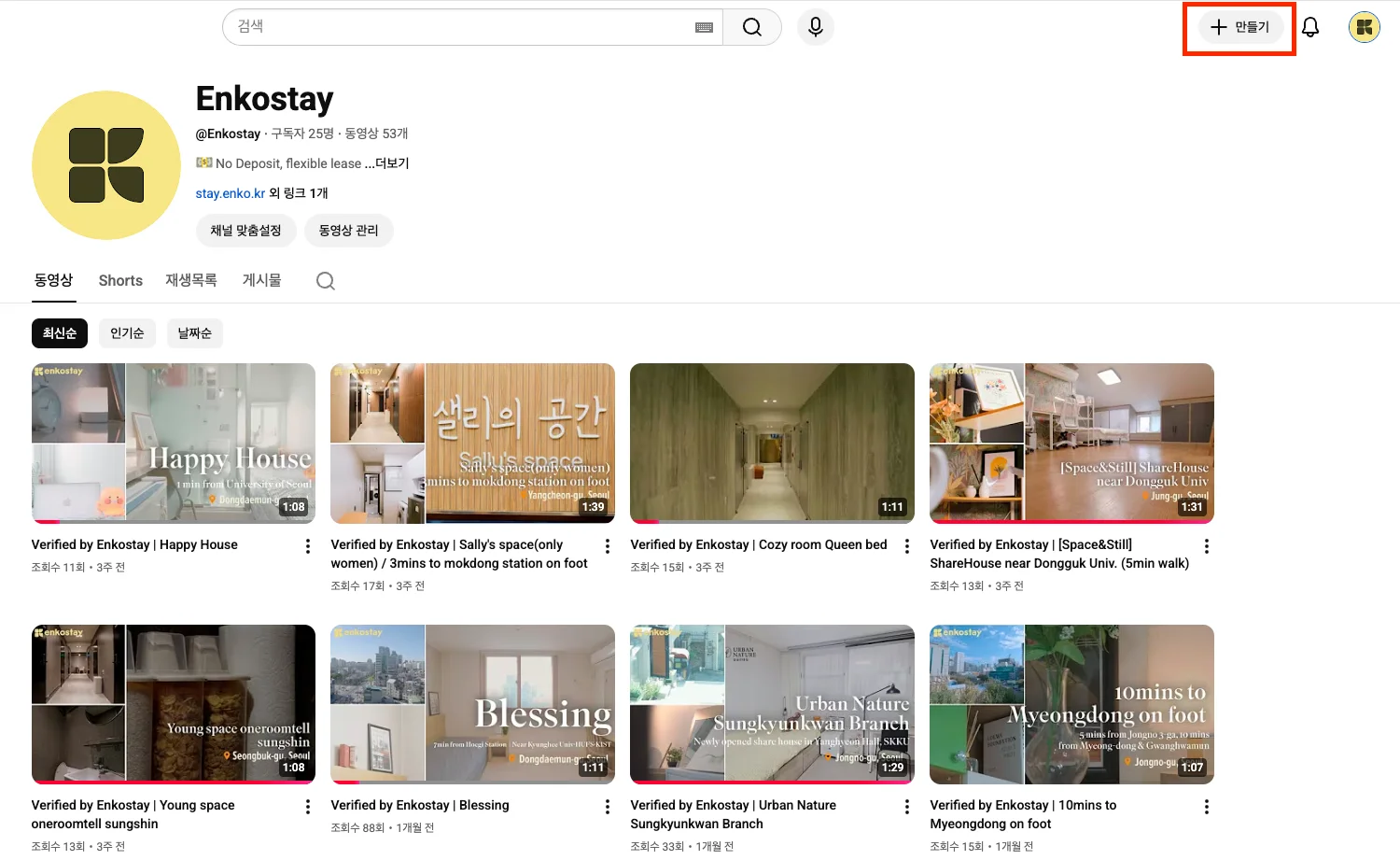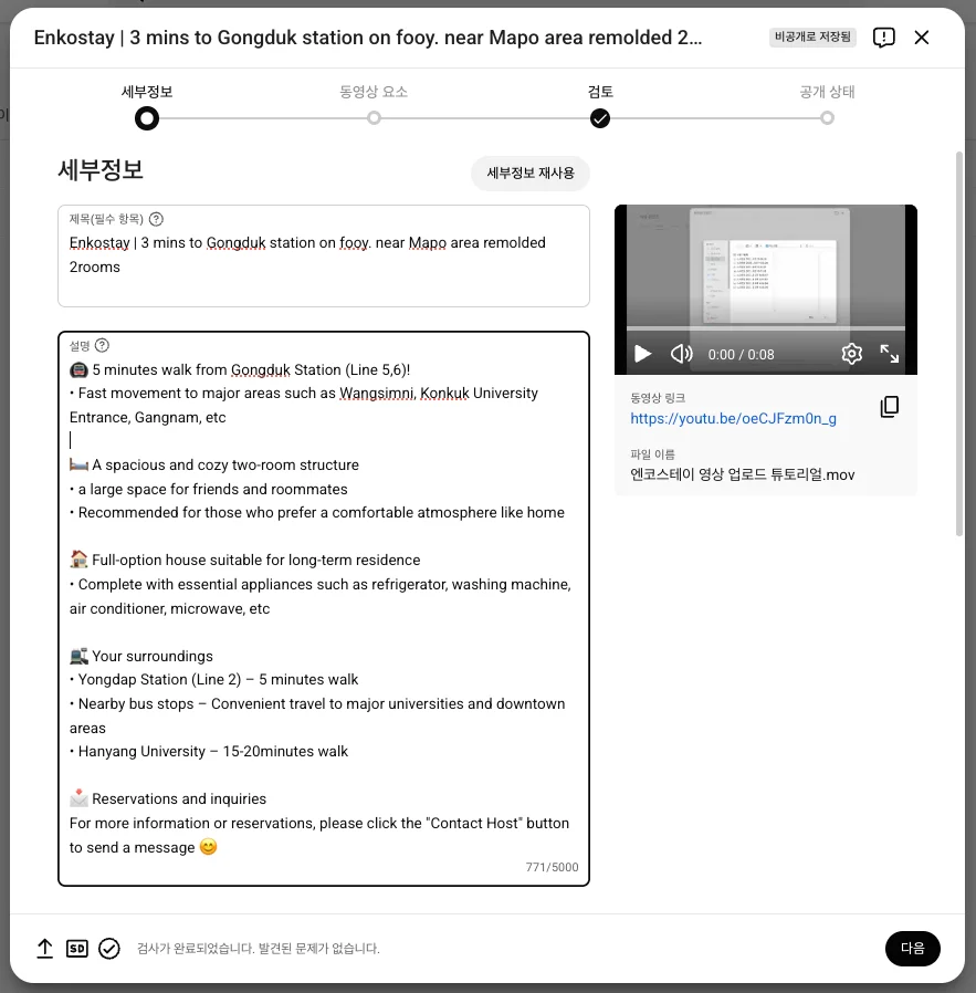 마지막으로 업로드된 영상의 URL 링크를 복사하여, 엔코스테이 팀에 전달하여 스테이 상세 페이지에 영상 게재 요청을 진행해 주세요.