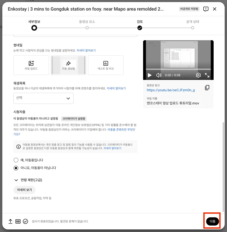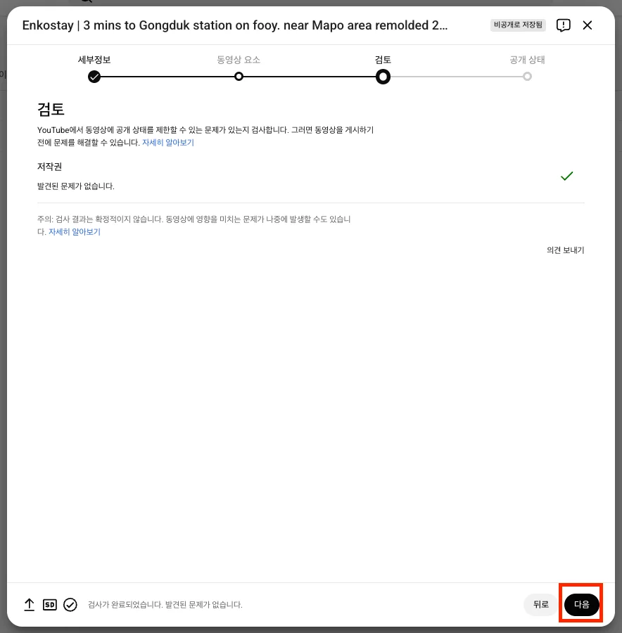 검토 단계에서 저작권 관련 내용을 확인한 뒤 문제가 없다면 ‘다음’ 버튼을 클릭해 업로드를 진행합니다.