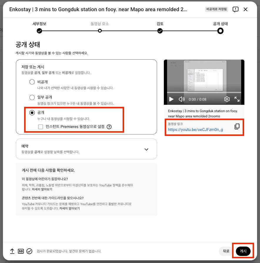 공개 상태를 ‘공개’로 설정한 후 ‘게시’ 버튼을 클릭하면 업로드가 완료됩니다.