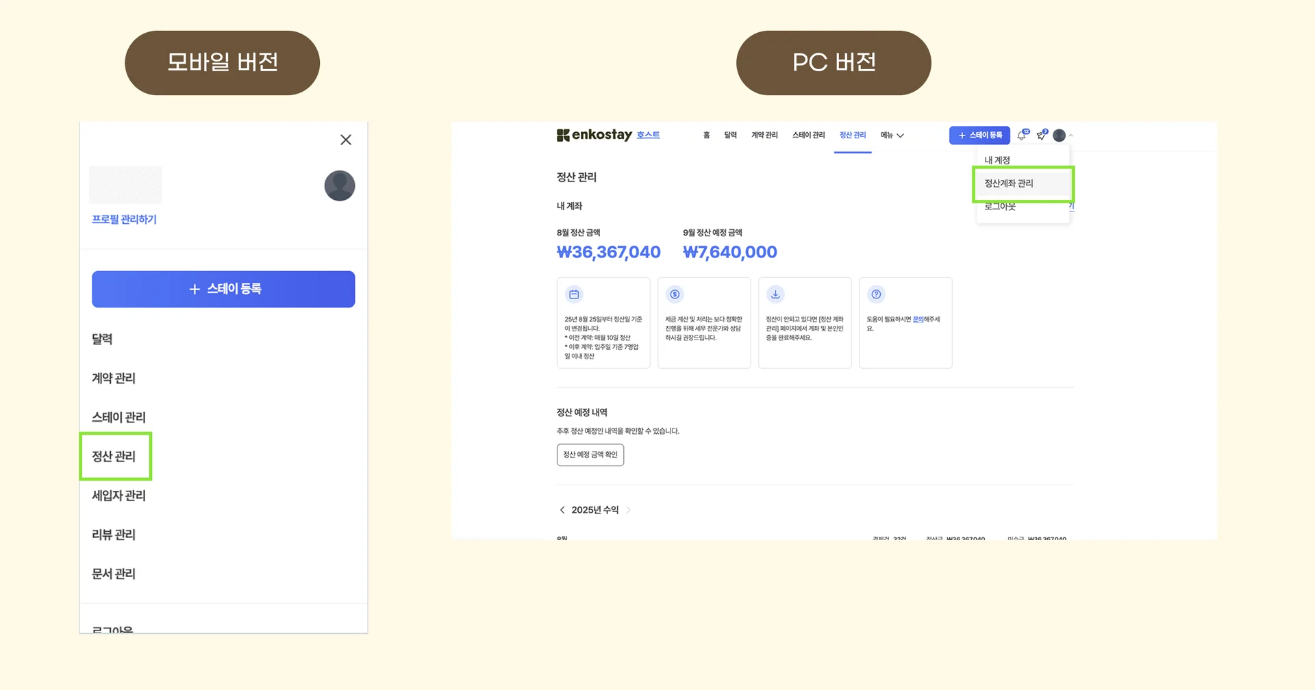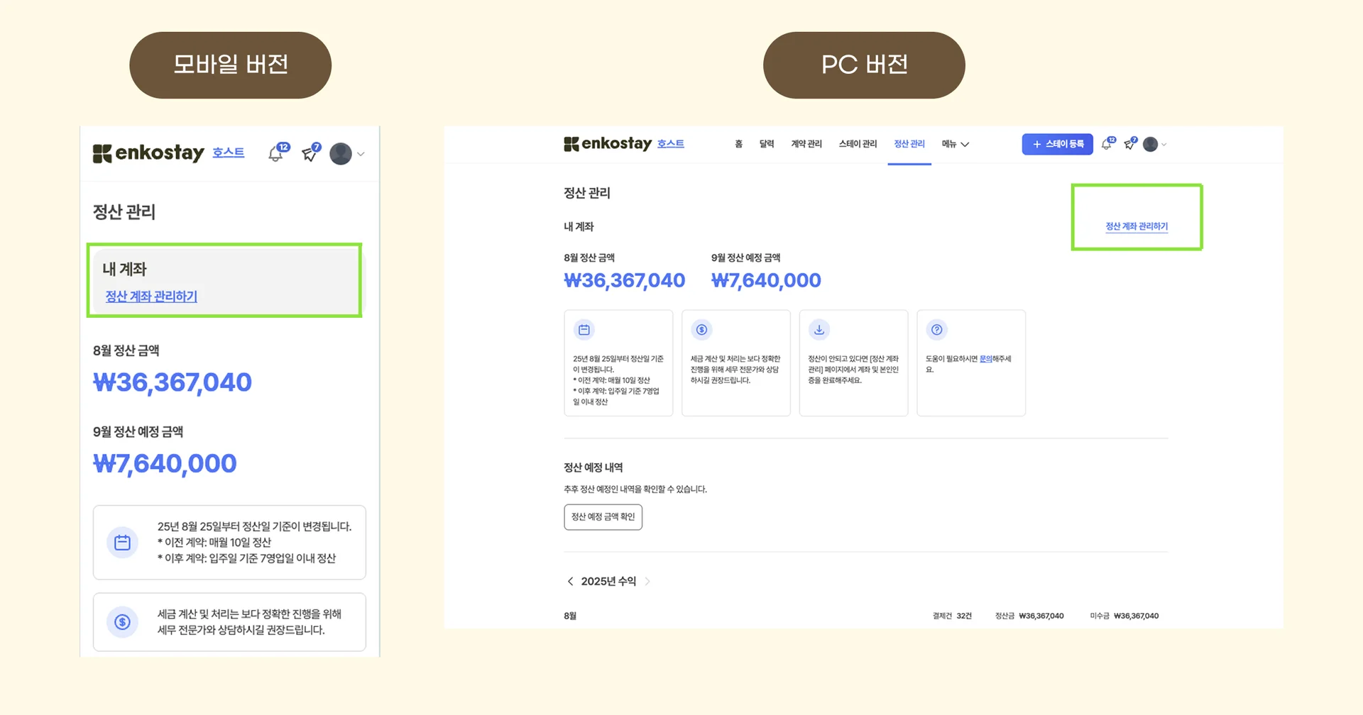 기존에는 입주일을 기준으로 익월 10일에 세입자가 결제한 금액에서 엔코스테이 수수료를 제외한 금액이 정산되었으며, 90박 이상(연장 시 60박 이상) 계약의 경우 매달 10일마다 분할 결제된 금액만큼 정산이 진행되었습니다.