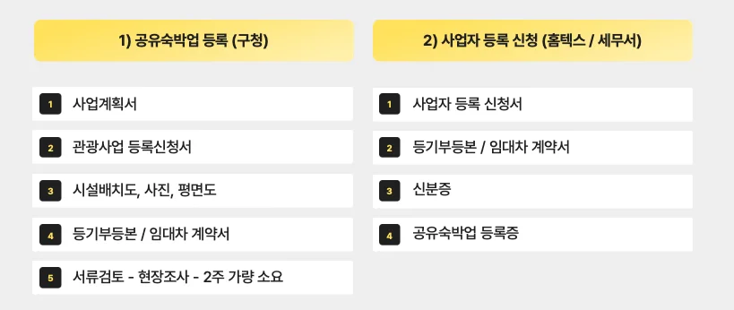 공유숙박업은 단순히 플랫폼에 매물을 올리는 것만으로는 합법적이지 않습니다. 건물 유형에 맞는 숙박업 신고가 선행되어야 하며, 이후에는 국세청 사업자 등록까지 마쳐야 합니다.